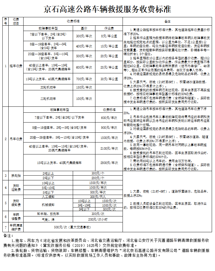 河北京石高速公路开发有限公司车辆救援服务信息公示表
