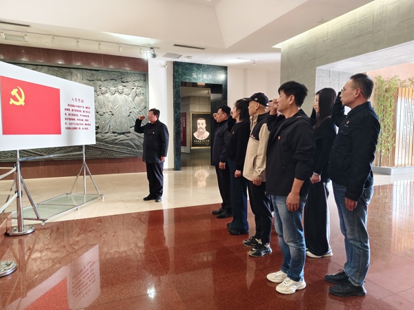 在李大钊纪念馆前,全体党员整齐列队,面向党旗庄严宣誓,重温入党誓词。铿锵誓言回荡在广场上空,彰显了同志们坚守初心、勇担使命的坚定信念。
