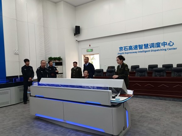 高速专班指挥中心、四支队情指中心一行首先参观了京石公司智慧调度中心监控大厅,详细了解了京石路警联合指挥中心运行情况,对路警高效协同、快速处置突发事件的能力表示赞赏。