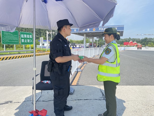 收费站广场前设置了多个卡点,大部位警察同志在公安检查大棚下查验上路车辆,相对还不是很热。出入口掉头的开口处,只有一个小小的遮阳伞,一名执勤警察汗流浃背,却依然腰板挺直地坚守岗位。定兴收费站工作人员看在眼里,莫名心酸。当班值班站长在自助售卖机买了几罐雪碧,带着一位员工上前慰劳,将几罐冰凉的雪碧递到执勤警察手中,希望能为他们送去一份夏日的清凉与关怀。