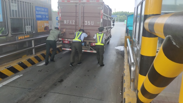 根据绿通车免费政策,车辆需单独称重过磅,严禁硬拖通过。李根党了解情况后,迅速拿起对讲,寻呼绿通检验员李东洋和吴义挪,同时与副驾驶人员沟通,一同帮忙推车。众人齐心协力,喊着口号,车辆缓缓驶向磅台。在大家的努力下,车辆成功驶过磅台。经计算吨位,该车符合绿通车免费标准。随后,众人又一鼓作气,将车推至验货区。此时,大家的脸上和身上早已浸满汗水,衣衫也被汗水湿透,但没人有丝毫怨言。