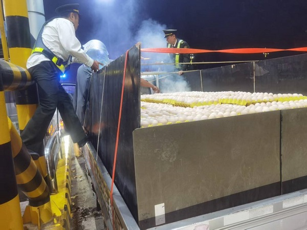 10月2日21时许,一辆车牌号为津GXXXX的货车驶入高碑店收费站12车道。正在岗亭内执勤的收费人员敏锐发现,该车车厢顶部装载鲜鸡蛋的纸质蛋槽内突然冒出浓烟,明火随即窜出。收费员立即通过对讲机向值班站长刘伟紧急报告,并迅速示意司机将车辆停靠至安全区域。