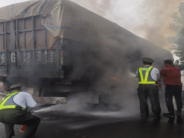 “老吴!快拿灭火器,有车着火了!”收费员邢毅对讲机里喊道,只见他手拎灭火器立即向外广场奔去。 10月4日上午10点40分左右,正值节假日出行车流高峰时段,在藁城北收费站出口外广场与国道的交接处,一辆满载煤炭的六轴重型货车突然发生自燃。司机跑到收费站寻求帮助,收费员邢毅和吴国忠没有一丝犹豫,迅速携带灭火器赶赴现场,在确保自身安全的前提下,对着火点展开灭火,为后续专业救援争取宝贵时间。据司机描述,刚发现冒烟就赶紧停车查看,谁知停好车这火苗就窜起来了。