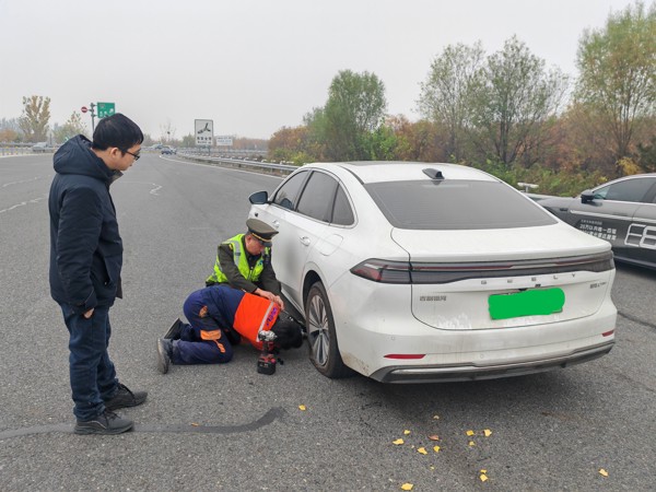 11月6日上午8时许,一辆白色新能源轿车因左后轮突发爆胎被迫停靠在涿州站入口内广场处并亮起了双闪警示灯。这一异常情况被现场工作人员第一时间发现,并立即上前查看情况。