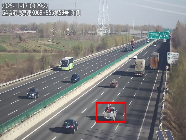 9时40分,第一养护工区工作人员抵达事发地点,迅速开展应急清理作业:工作人员规范设置安全警示区域后,快速将散落的金属梯子拖移至应急车道,随后高效完成路面清理及安全隐患排查,确保道路通行条件全面恢复。与此同时,溯源调查工作也在紧锣密鼓推进。因掉落障碍物处于监控摄像头盲区,无法直接捕捉到具体掉落车辆,监控员及时转变排查思路,通过调取沿线监控视频,重点筛查载有金属梯子的货车轨迹,并逐一对比障碍物出现前后的镜头画面,核查货车装载情况。经过半小时的细致筛查与精准比对,监控员在K69+955路段监控镜头下发现一辆蓝牌小货车,其车厢内明确载有同款金属梯子;而在K69+005路段的后续监控画面中,该货车车厢内的梯子已消失不见。据此,成功锁定车牌号为冀FZXXXX的嫌疑车辆,并迅速整合车辆通行轨迹、全程监控视频、现场处置照片等关键证据,构建形成完整闭环的证据链,第一时间反馈至高速交警涿州大队。交警部门随即对责任车辆驾驶人开展交通安全警示教育,压实安全主体责任。