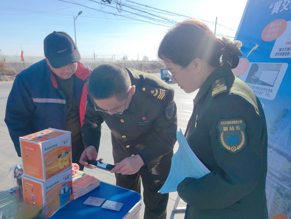 “师傅,歇脚时不妨看看这个!”工作人员手持宣传页,向刚停稳的货车司机热情介绍“冀交万里行”“京石易行”小程序,针对司机们关心的“操作复杂吗?”“优惠实在不?”等问题,团队现场演示、耐心解答,把“年终冲刺”的干劲融入一句句贴心提醒里。
