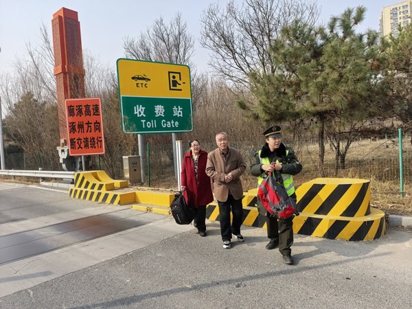 3月16日,京石高速涿州收费站上演温馨一幕。两位老人计划前往北京探亲,在站区计重车道内等候接驳车辆,因身处车流密集区域,存在较大安全隐患。