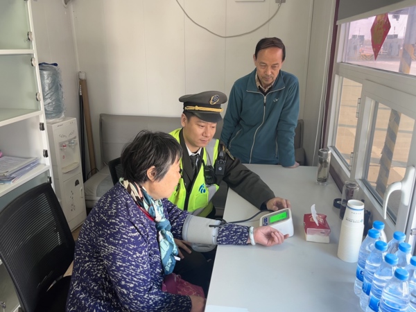 车内是两位年逾七旬的老人,经了解,老爷爷驾车出行时不慎走错路线,在周边辗转许久仍找不到回家的路,长时间的奔波让两位老人焦急不已,老奶奶因过度着急突发身体不适,出现头晕头痛、胸口发闷、心脏不适的症状。工作人员见状,立刻耐心安抚老人情绪,细心询问老奶奶既往病史,得知老人患有高血压后,迅速取来血压仪为其测量血压,时刻关注老人身体状况。