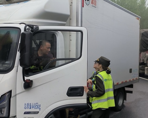 清晨能见度极,室外凉意阵阵,长时间的等待让滞留的司机师傅们难免心生焦急,不少人还未来得及享用早餐,空腹等待的疲惫与焦躁愈发明显。心系司乘冷暖,涿州站的工作人员们来到滞留车辆旁,为每一位等待的司机送上暖心关怀。