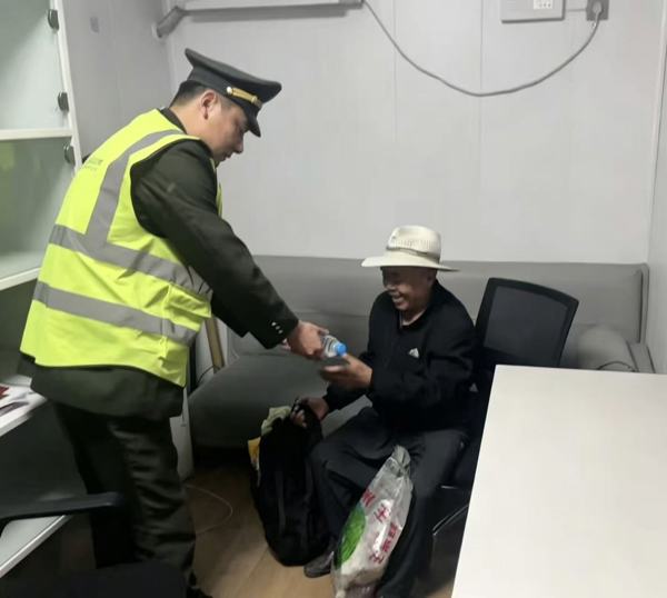 老人年纪偏大、孤身一人,对当地路况全然不熟,不清楚如何前往目的地,一时间不知该去往何处,神情慌张、手足无措。正在执勤的工作人员发现老人的异常情况后,立即主动上前安抚老人情绪,耐心轻声询问老人的需求。