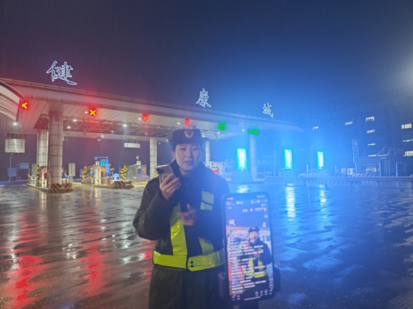 “大家好,我现在就在健康城站站口。”收费员闫孟茜面向镜头,正通过直播向司乘人员介绍雪天路况与安全提示。雪花不时掠过镜头,她的声音热情、有力,实时播报着收费站区及主线省界的通行情况,为屏幕前的司乘人员提供了第一手、最直接的路况信息。