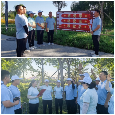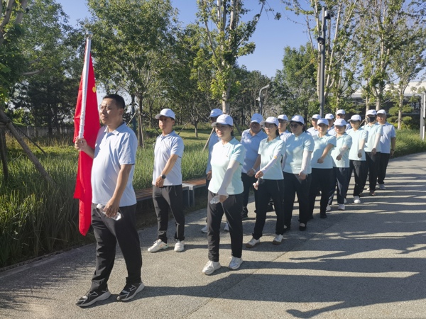夏日的丝路友谊园绿意盎然,蜿蜒步道如一条银色纽带。员工们精神饱满,步伐矫健,在党旗的引领下阔步前行。一枚枚胸前闪耀的党徽,在绿树碧草的映衬下格外醒目,无声诉说着对党的忠诚信仰。