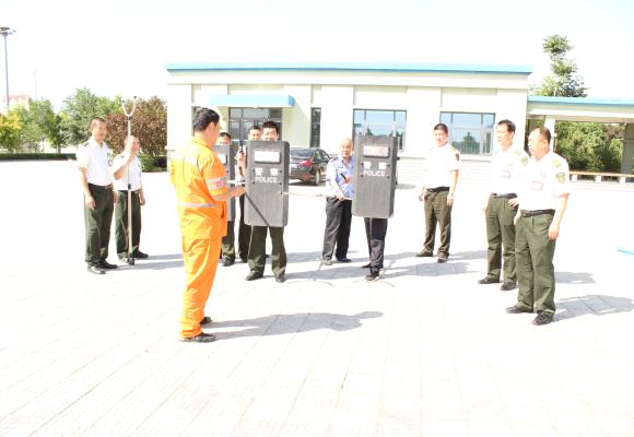 随后参与培训的人员结合讲解的要领开展了防盗抢预案演练。演练由电工模拟持刀抢劫人,安保和值班人员持防暴钢叉和盾牌按照预定队形和器械使用要领对抢劫人进行制服。