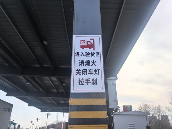 在验货区核心立柱等醒目位置,张贴带有反光效果的“进入验货区 请熄火 关闭车灯 拉手刹”标识,搭配货车查验图标。反光材质让标识在自然光下清晰直观,在夜间或雨雾天气中,通过车辆灯光照射形成强烈反光,清晰传递操作要求,从车辆状态管控上杜绝溜车、灯光干扰等风险,为查验人员营造稳定安全的作业环境。